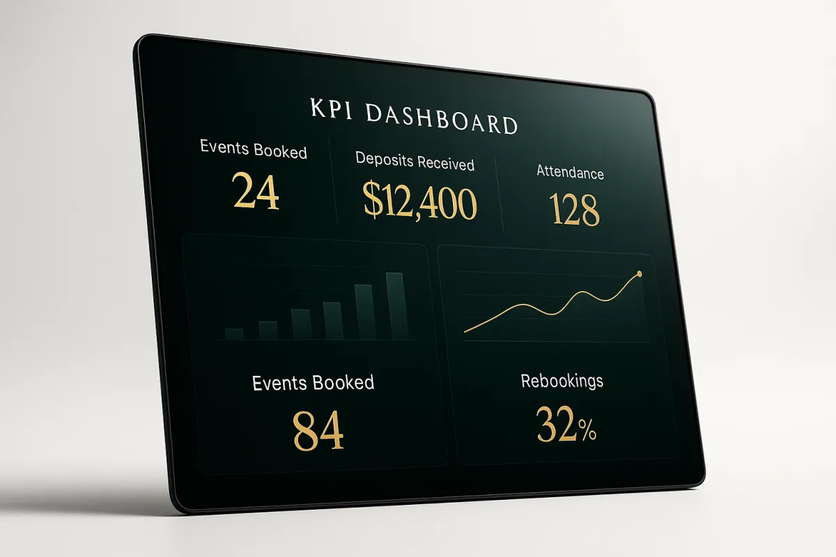 Your KPI dashboard displays events booked, deposits received, attendance, and rebookings. You see transparent metrics that confirm success and release your performance balance.