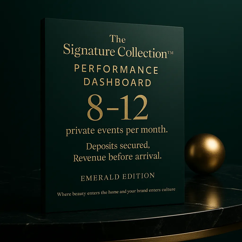 Eight to twelve Signature Collection events per month. Three or more guests per event. Deposits collected. Revenue secured. Brand elevated. We connect new and existing audiences into a single, self-sustaining system that flows every week. You focus on care. We handle precision.